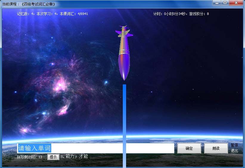 游戏的模式是:太空中出现一枚核弹,正在飞速向地球飞来,用户必须在几秒中内输入引爆密码,在核弹飞临地球前引爆,引爆密码就是所出现单词读音的拼写。