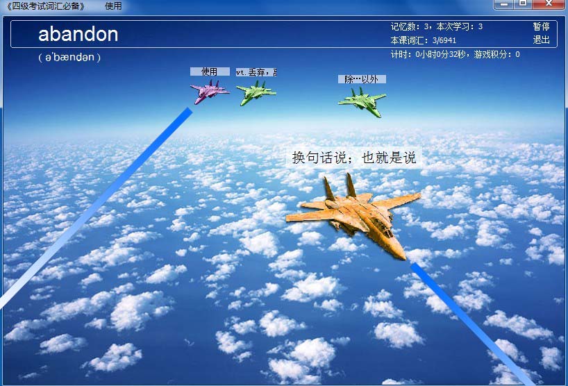 单词游戏以射击飞机方式进行,系统出现单词发音及单词拼写,然后出现几架高速飞来的飞机,每架飞机代表一个单词解释,用户要在飞机落地之前进行判断并射击,单词速记游戏原理同单词速记模式,只是以游戏的方式体现,用户选择课程,然后选择“单词游戏模式”。
