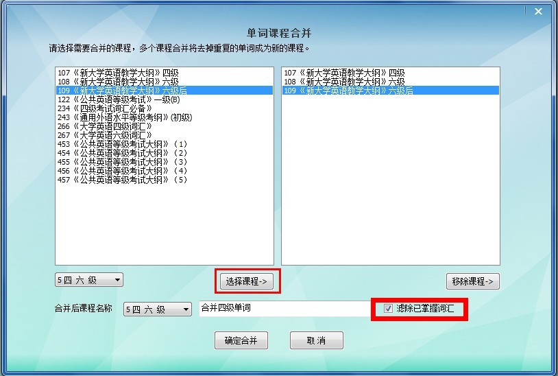 点击系统设置-->单词课程合并,该功能可以合并多个课程为一个课程,并自动删除重复的词汇。用户可以在此过滤所有已学单词,这样就不用重复出现已经掌握的词汇。