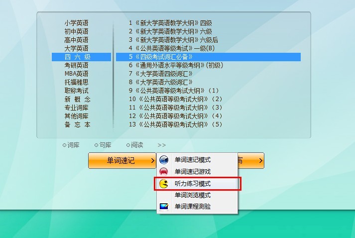 该学习模式同速记模式基本相同,只是系统出现单词的时候,只出现该单词的读音,而不出现单词的拼写和解释,用户要根据单词的读音判断自己是否知道该单词,并做出选择,该模式主要训练用户的听力。